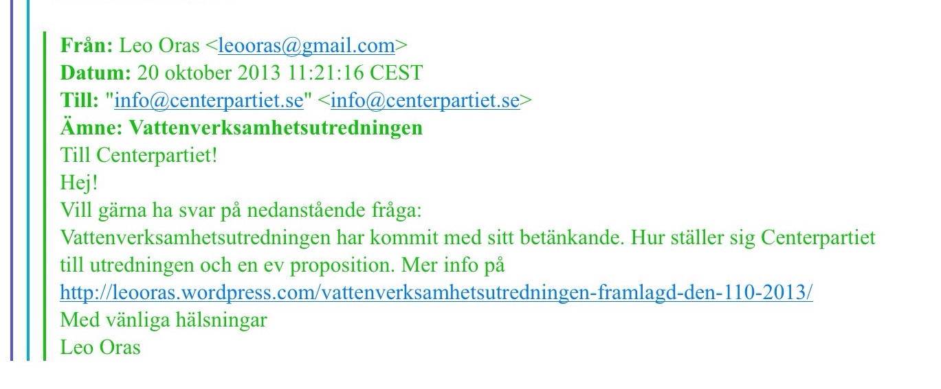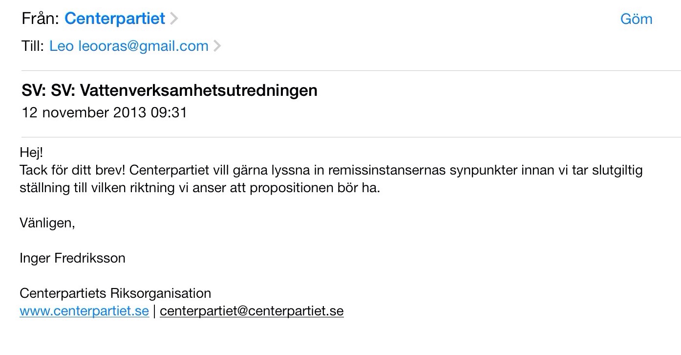 Nedan kan du läsa Centerpartiets svar på min fråga, som står längst ner på inlägget, om Vattenverksamhetsutredningen.