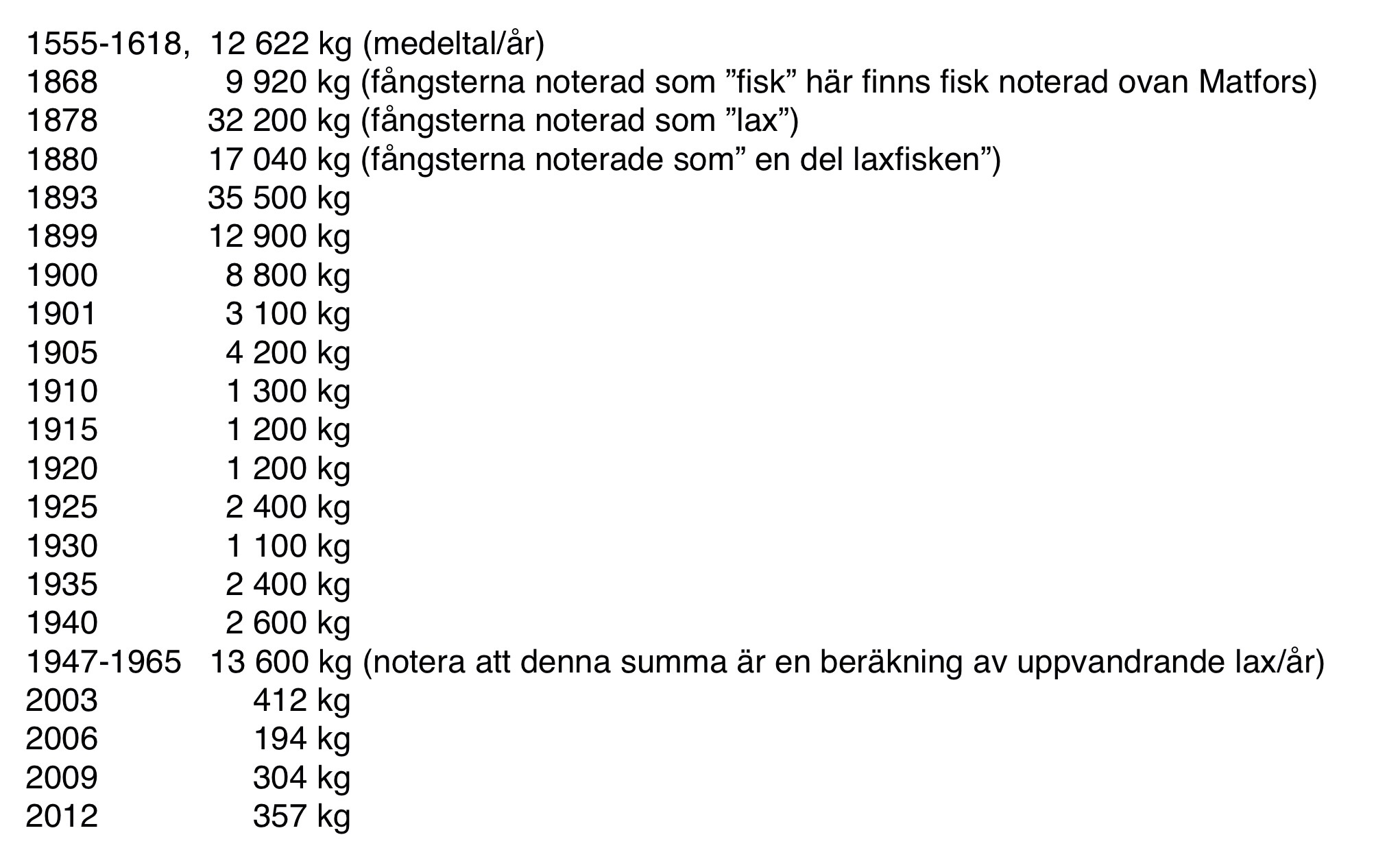År 1698 Byggdes Matforsen över helt av fasta fisken & det rapporterades att i princip all vandrande lax fångades.