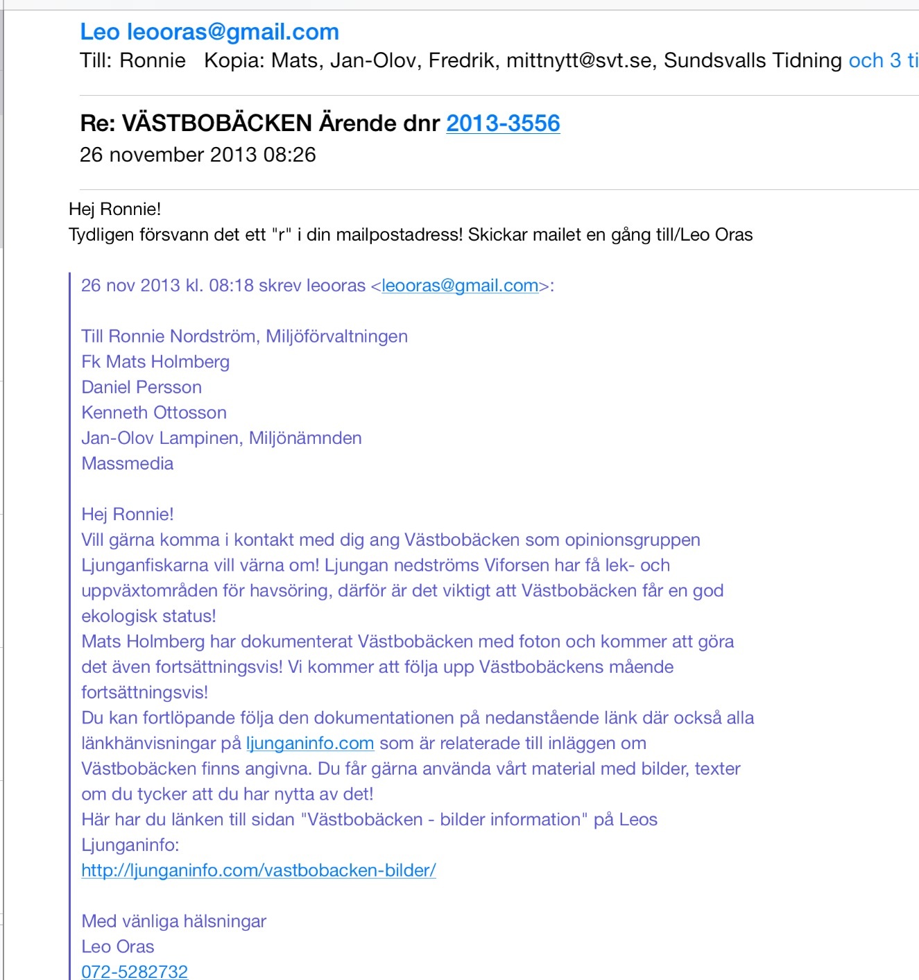 Nedan kan du läsa mitt mail till Miljöförvaltningens handläggare Ronnie Nordström ang Västbobäcken!