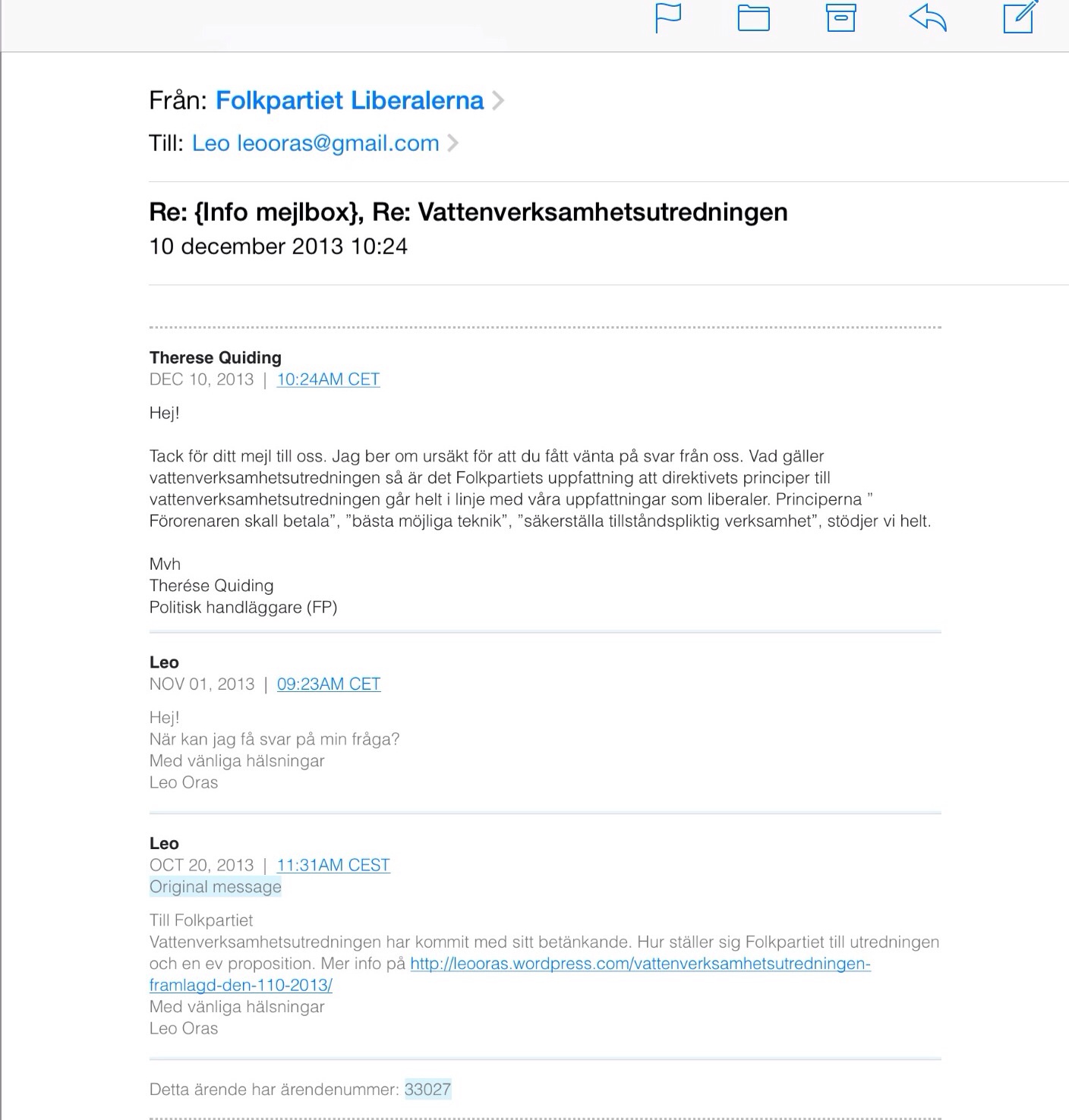 Läs Folkpartiets svar på min fråga om Vattenverksamhetsutredningen. Min fråga finns längst ner på kopian av mailväxlingen. Folkpartiets svar finns längst upp.