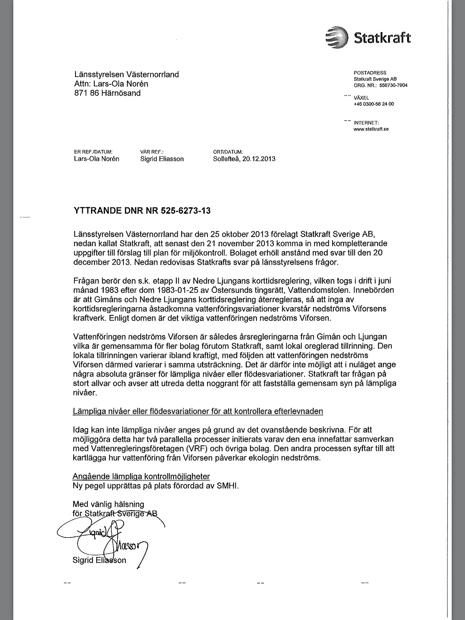 Statkrafts svar på Länsstyrelsens föreläggande från den 25/10 2013. Läs inlägget med föreläggandet på länken nedan!