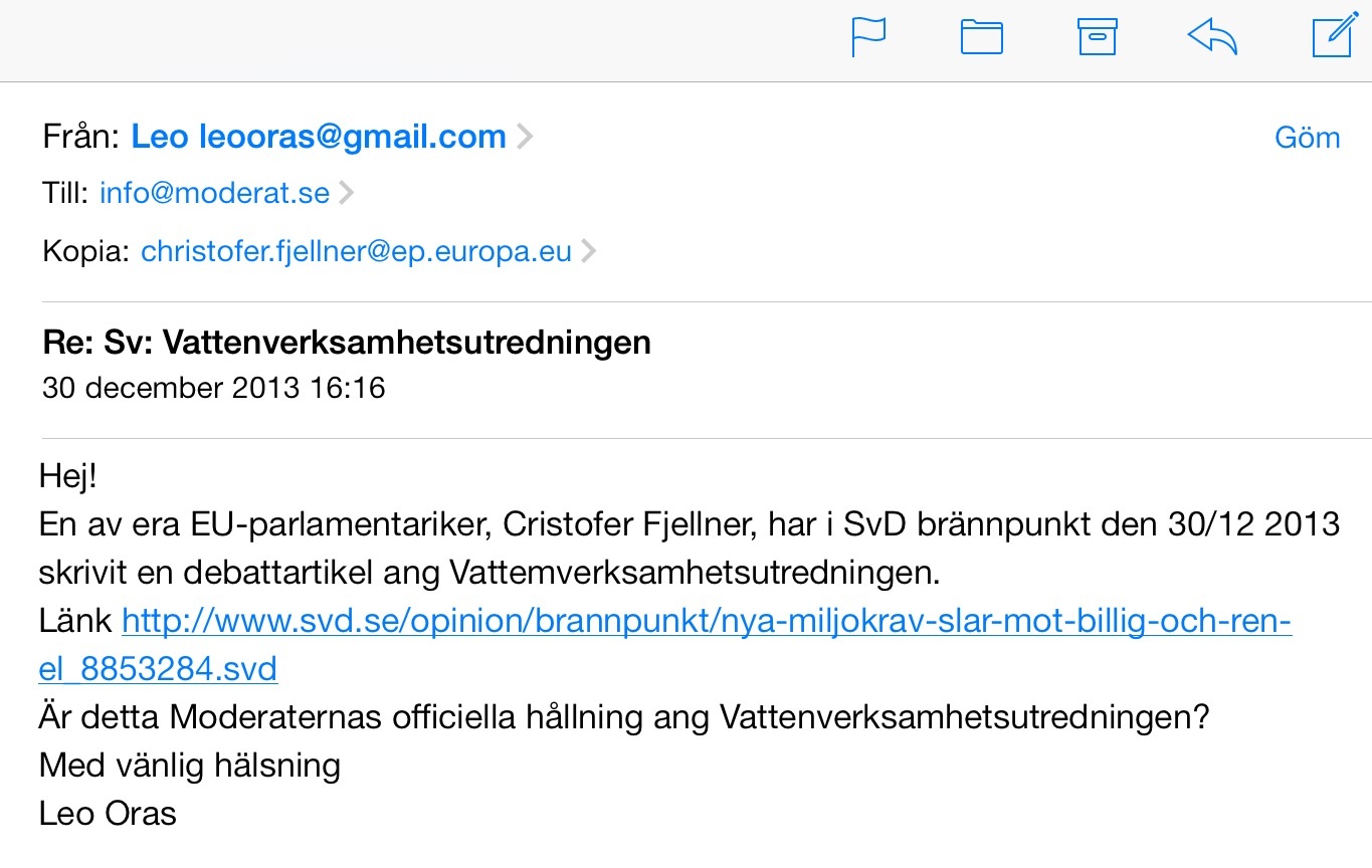 Jag har mailat följande fråga till moderaterna för att få ett klarläggande om var de står ang Vattenverksamhetsutredningen.