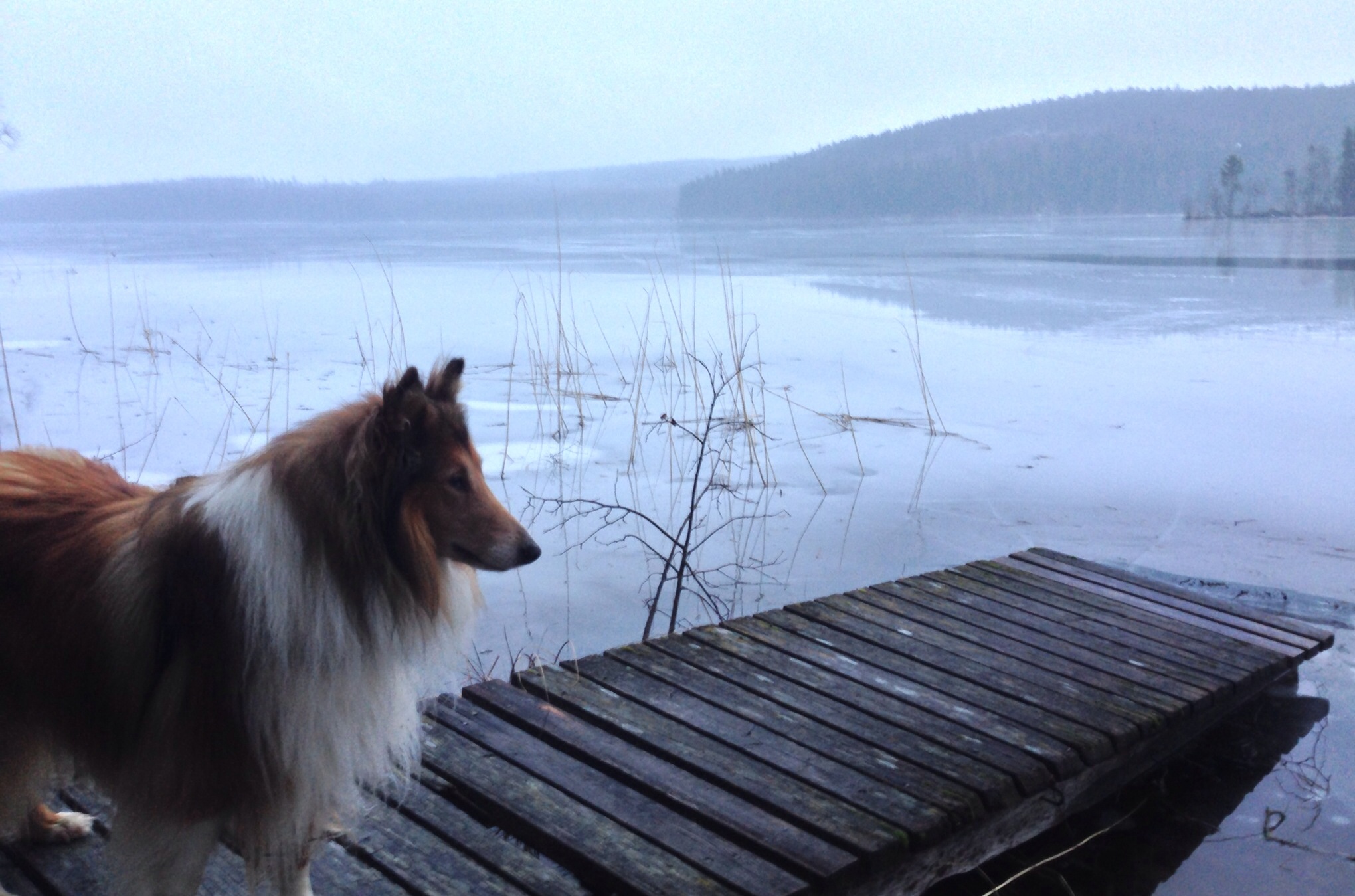Ingen snö, bara is, som dessutom ser farlig ut, tycker collien Ramus. Husse instämmer!