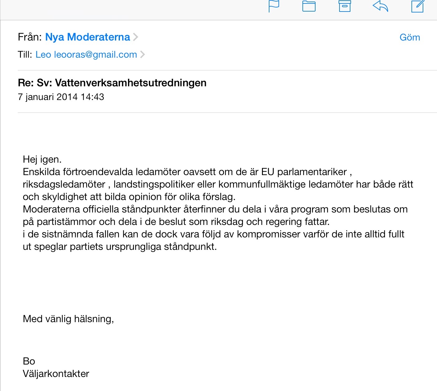 Moderaternas svar på min fråga ang Christoffers Fjellners artikel i SvD.