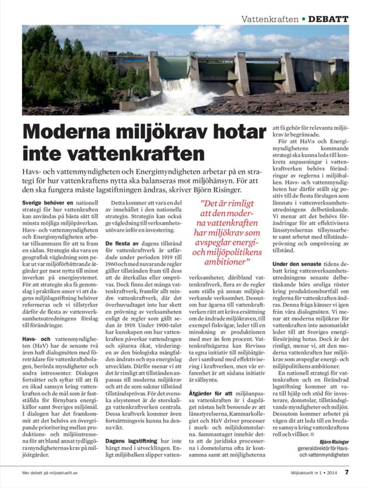 Björn Risinger Generaldirektör för Havs- och vattenmyndigheten har skrivit en debattartikel om Vattenverksamhetsutredningens förslag i Miljöaktuellt nr 1 – 2014.