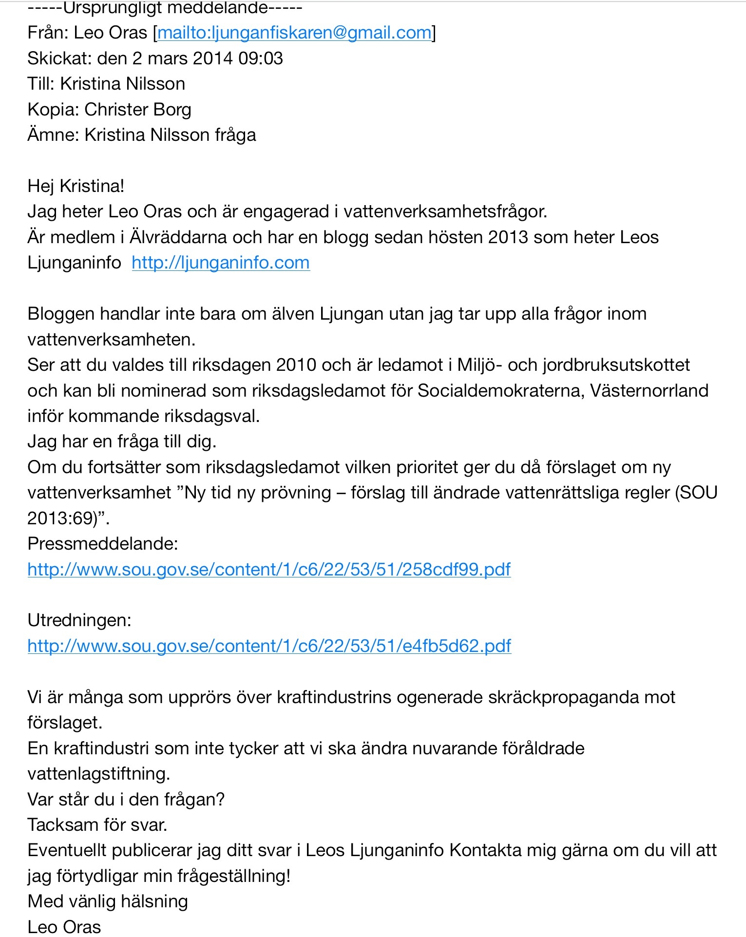Pingback: Socialdemokraternas riksdagsledamöter i Västernorrland. Fråga om Vattenverksamhetsutredningen | Leos Ljunganinfo