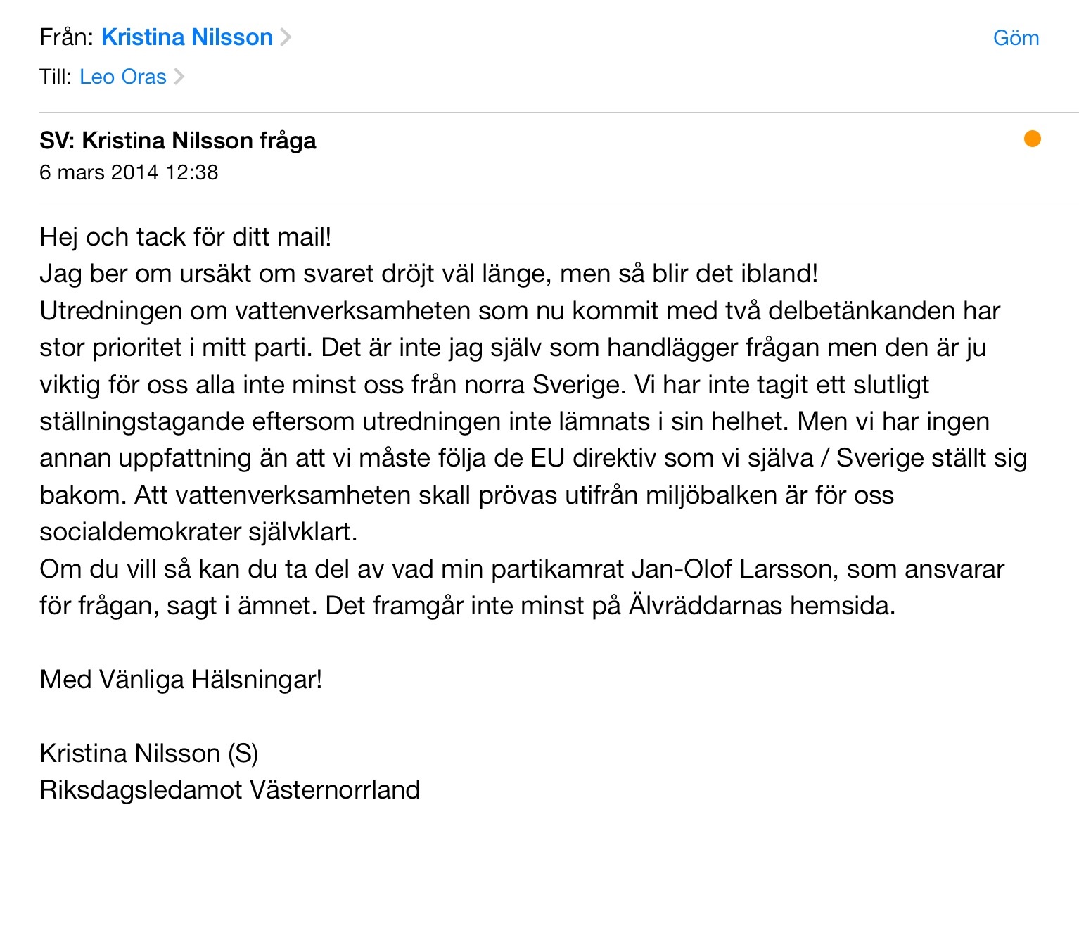 Jag har mailat till några riksdagsledamöter representerande Västernorrlands län om vilken syn de har på Vattenverksamhetsutredningen.