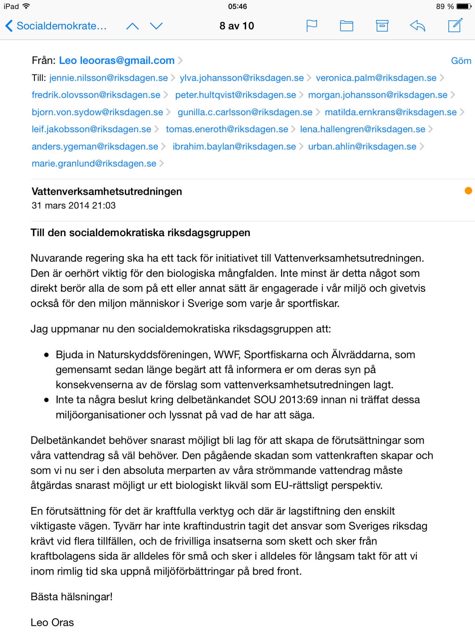 Detta mail har skickats till den socialdemokratiska riksdagsgruppen från flera avsändare den 31 mars 2014.