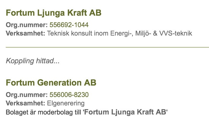 Moderbolag till Fortum Ljunga AB är Fortum Generation AB vars moderbolag är Fortum Sweden AB vars moderbolag är Fortum OYJ.