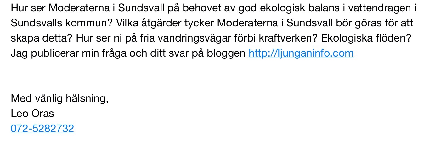 I skärmdumpen längst ner finns mailet med min fråga till Moderaternas ordförande i Sundsvalls kommun, Jörgen Berglund och längst upp svaret från Moderaterna som är skrivet av Per-Magnus Forsberg, vice ordförande i miljönämnden, Sundsvalls kommun.