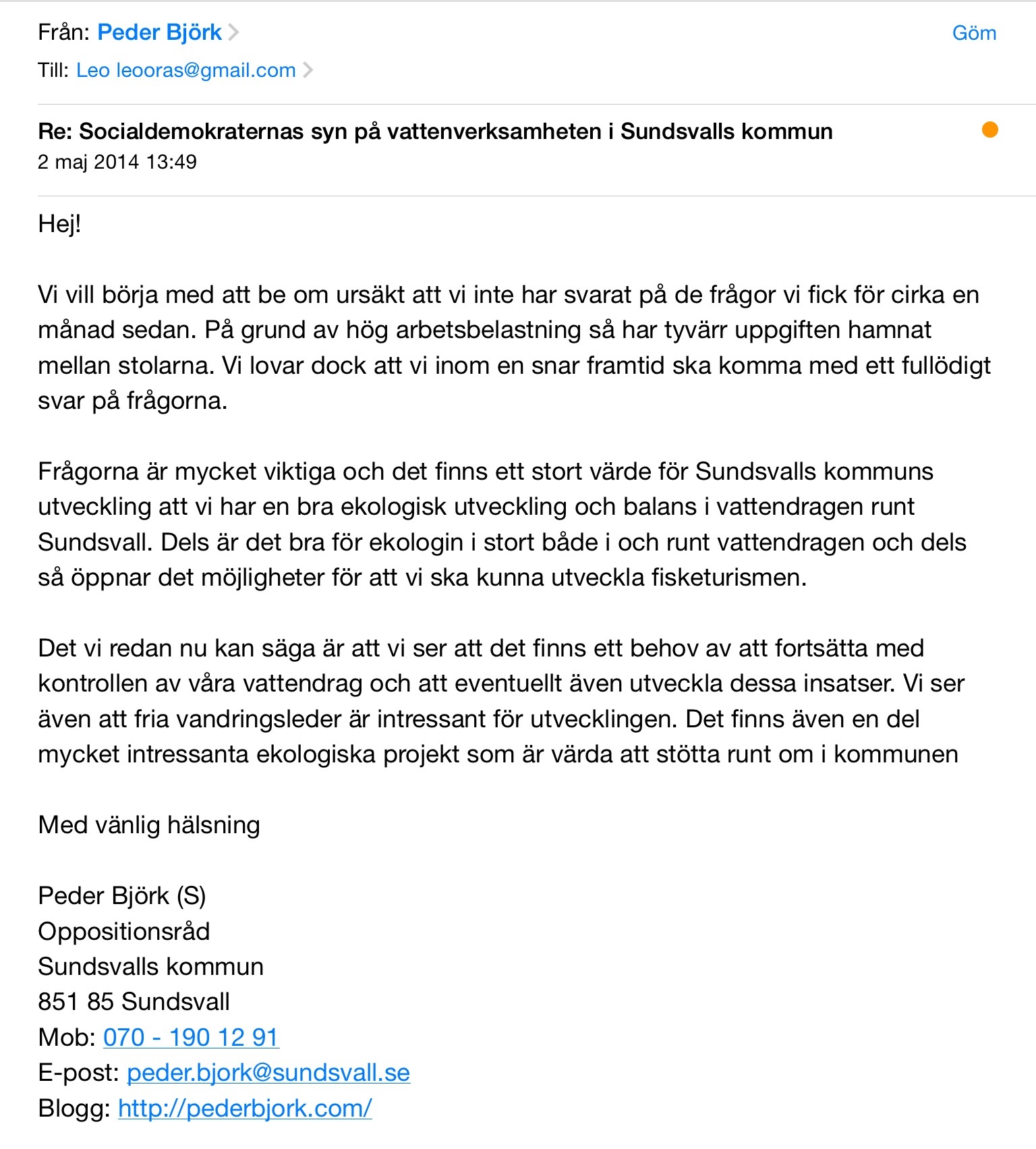 Men positivt är att Socialdemokraterna i Sundsvall värnar om kontrollfunktionen som fungerar bra på Sundsvalls kommunens miljökontor och att svaret också visar ett intresse för den ekologiska miljön i vattendragen samt att Socialdemokraterna i Sundsvall ser kopplingen god ekologi – fisketurism.