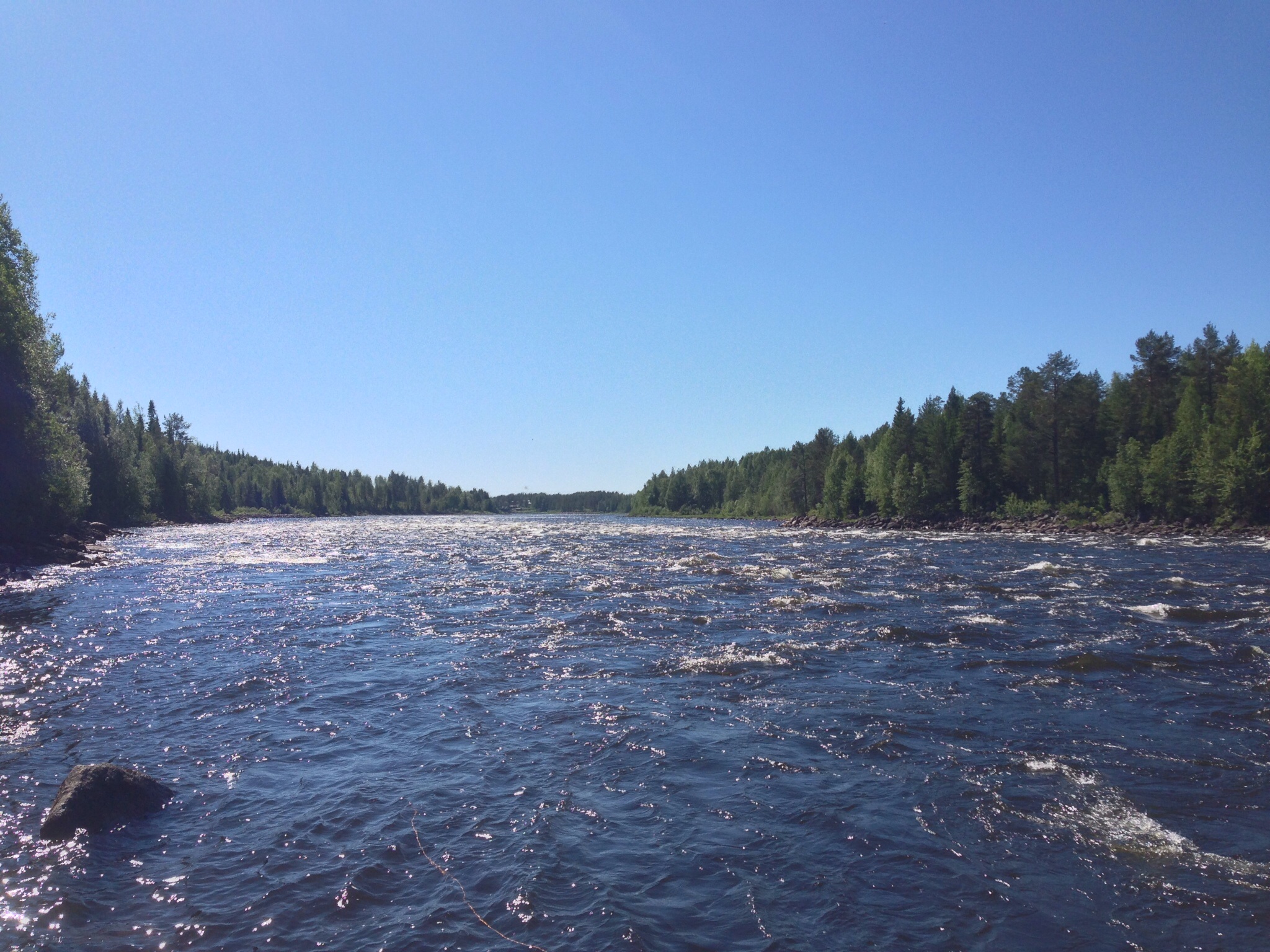 Kalix älv – Räktforsen – vattentemperatur strax under eller omkring 20 grader. Både luft- och vattentemperaturen är hög. Laxfiskare vet att det är svårt att få laxen att hugga vid en så hög temperatur. Men ….. vad gör det ….. när jag får vara vid älven och njuta av dånet från vattenmassorna i en helt oreglerad älv. Abborrarna och en och annan harr och gädda gillar mina laxflugor.