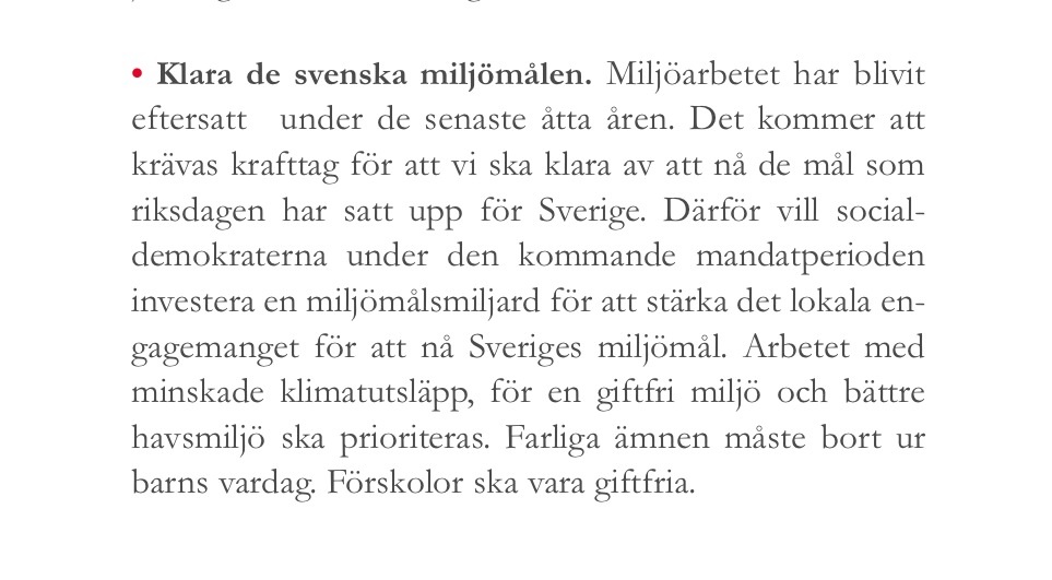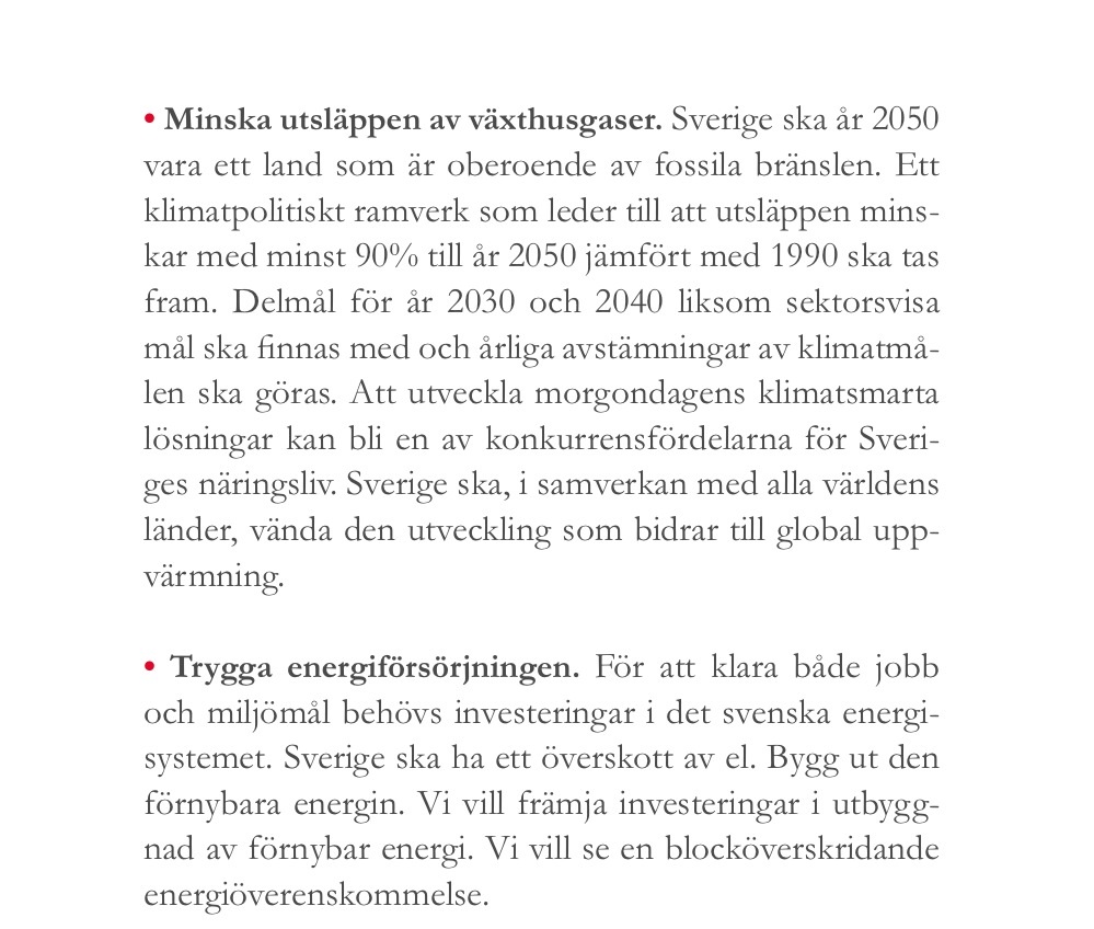 Jag tycker att den sammanfattningen stämmer bra med det som står i Socialdemokraternas valmanifest om miljön.