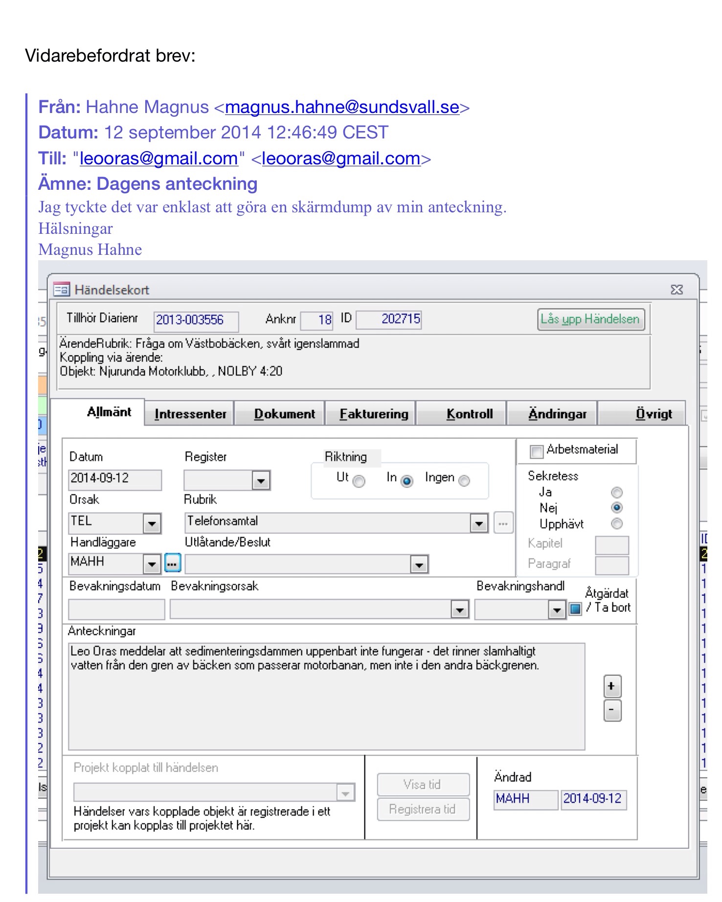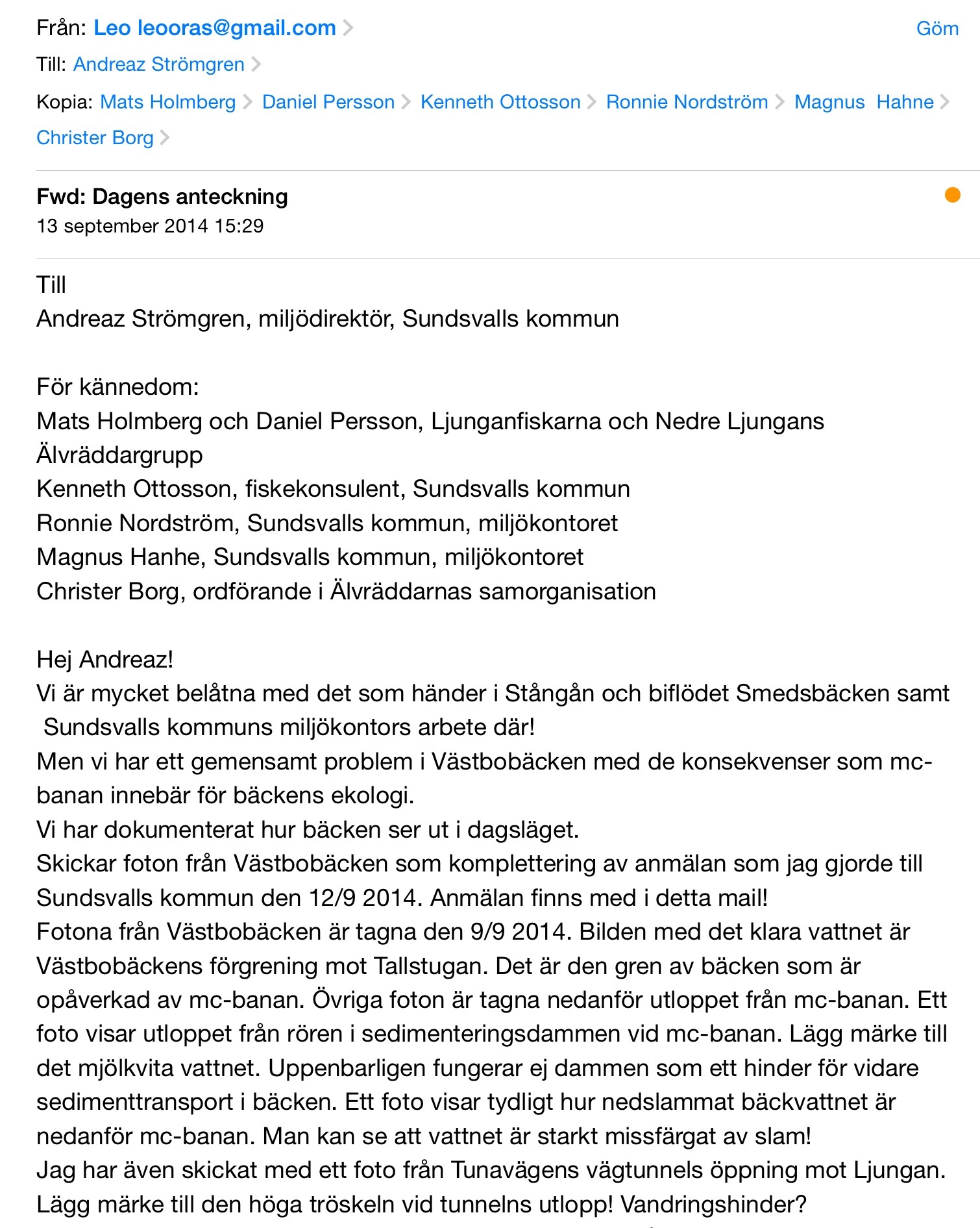 Jag har skickat in en anmälan till Sundsvalls kommun, miljökontoret ang den slamtillförsel till Västbobäcken som sker från banan som Njurunda Motorklubb disponerar /äger!