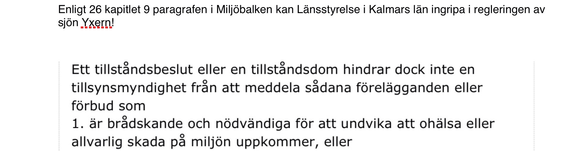 Enligt 26 kapitlet 9 paragrafen i Miljöbalken KAN Länsstyrelse i Kalmars län ingripa i regleringen av sjön Yxern! Se utdrag ur Miljöbalkens 26 kapitel 9 paragrafen nedan!