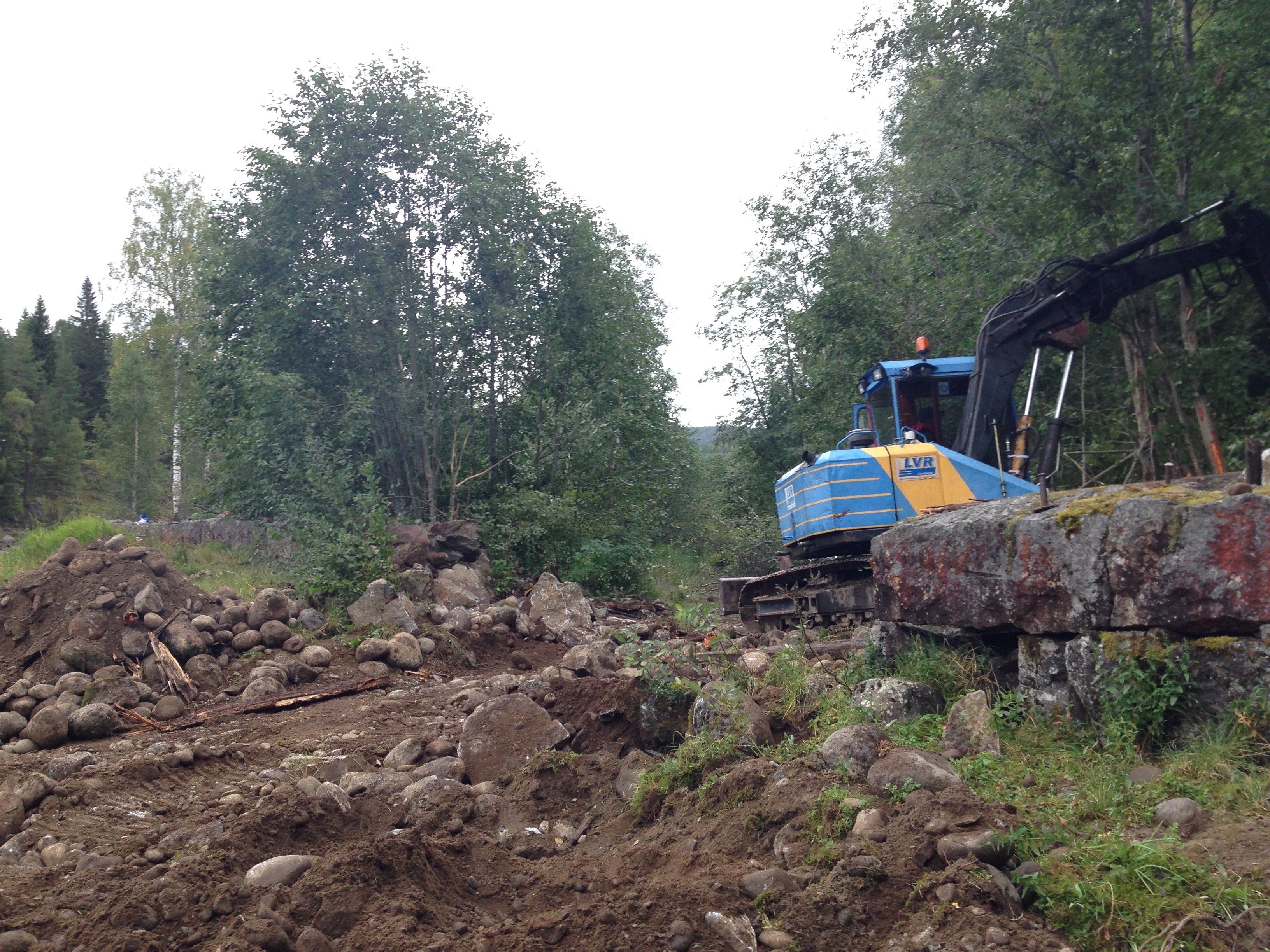 Jag besökte Grenforsen den 3/9 2015 där återställningsarbeten från flottningsepoken pågår. Bilden visar den plats där stenmuren öppnas med ca 6 meter.