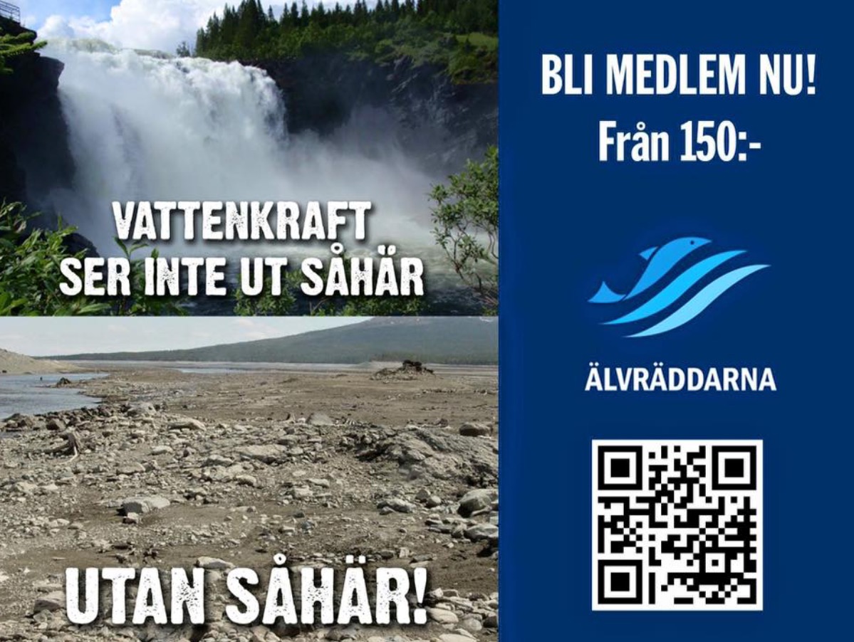 Tyvärr förstör vattenkraften den LOKALA miljön. Vattenkraften är INTE hållbar ur ett lokalt miljöperspektiv. Vi måste klara både den LOKALA och den GLOBALA miljön. Hur kommer världen att se ut annars? Miljöanpassa vattenkraften, ingen ny utbyggnad av vattenkraft, ersätt 1918 års vattenlagstiftning med en ny modern lag! Var kritisk mot vattenkraftbolagens påkostade reklam!
