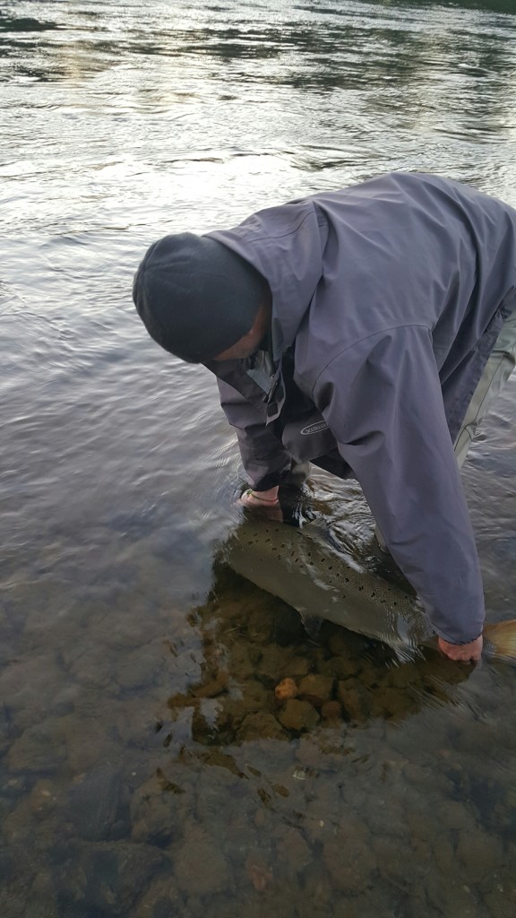 Längd 104 cm. Bilden visar hur Krister återutsätter laxen.