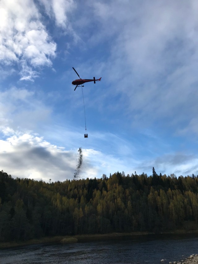 Idag torsdagen den 5/10 2017 har utläggning från helikopter av lekgrus och block vid Allstaforsen påbörjats. Klart nästa vecka. Allstaforsen ligger i Ljungan nedströms Viforsens kraftverk.