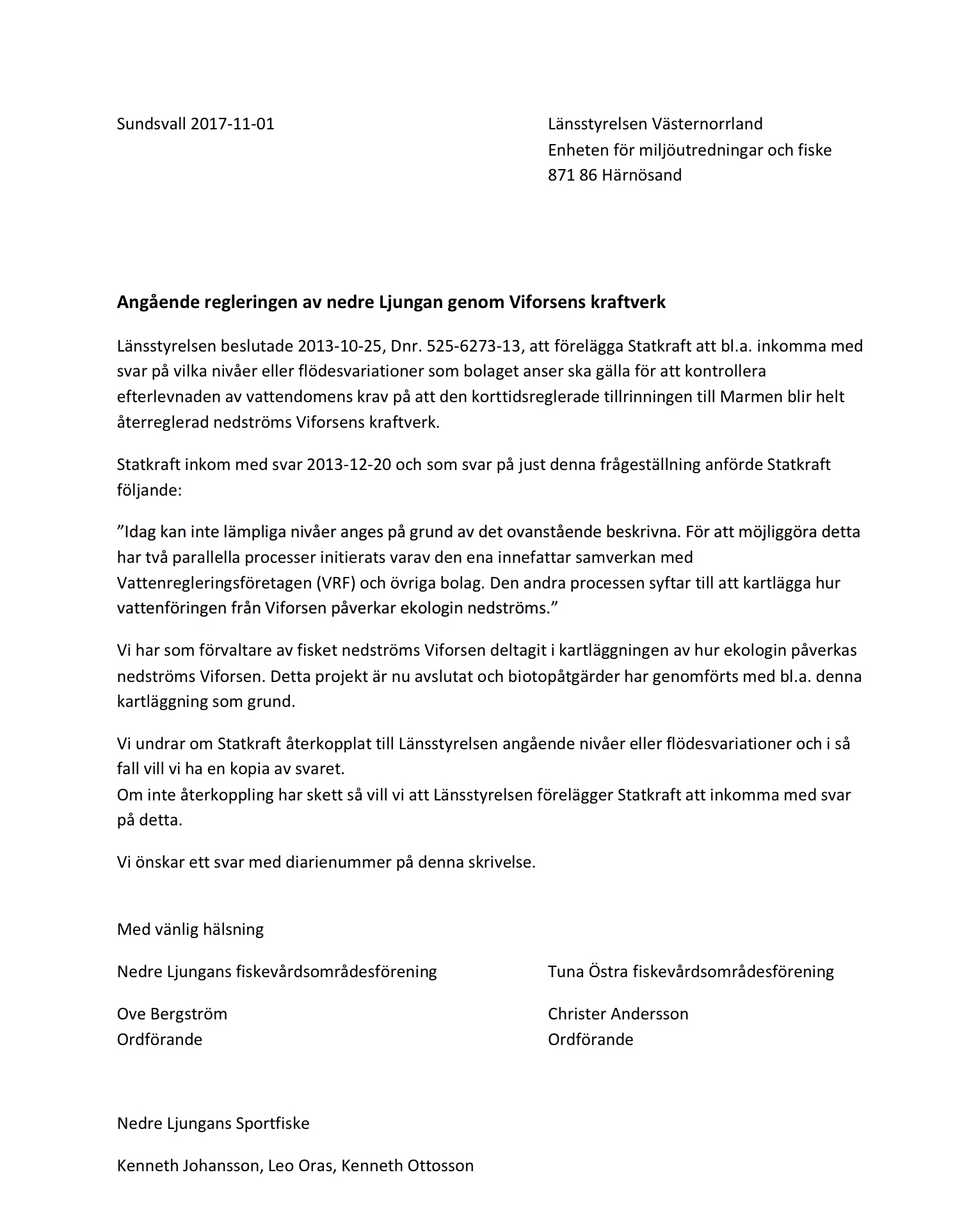Förvaltningsgruppen Nedre Ljungans Sportfiske har med ordförandena i respektive fiskevårdsområdesföreningar skickat nedanstående skrivelse till länsstyrelsen i Härnösand.