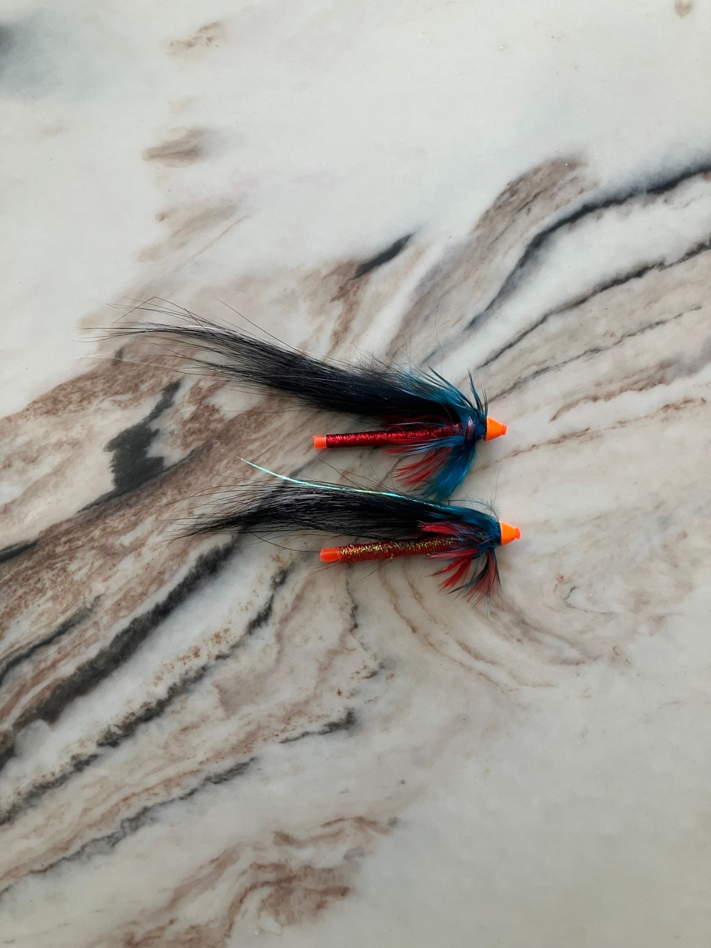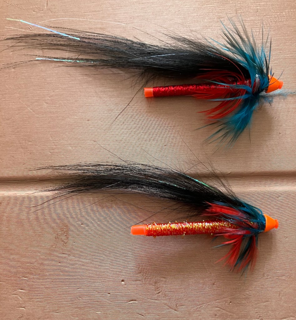 Två enkla tuber bundna för att fiskas – bruksflugor.