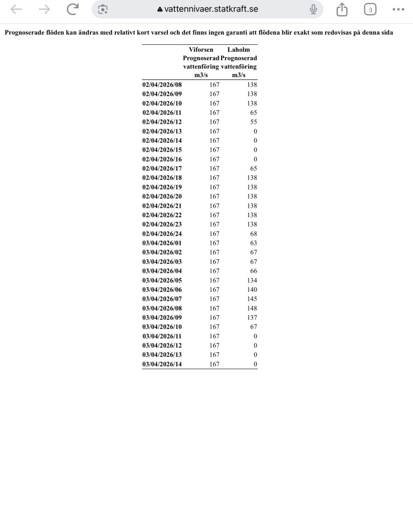 I skrivande stund är flödet 167 kbm/sek från Viforsens kraftverk.