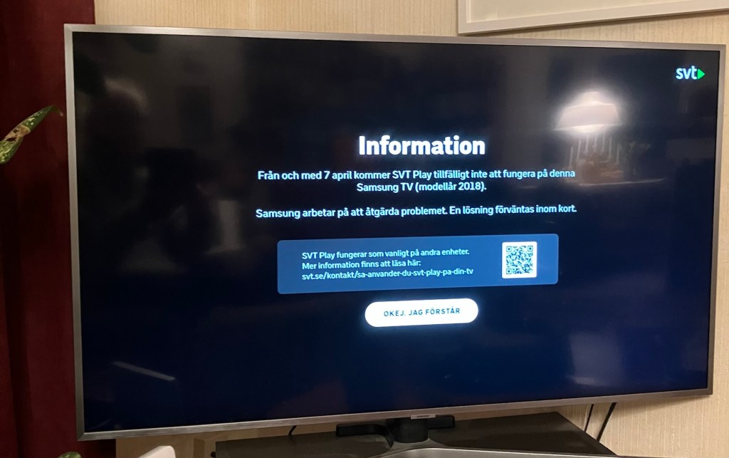 SVT Play har slutat fungera på vissa TV-apparater, bland annat Samsung-modeller från 2018.