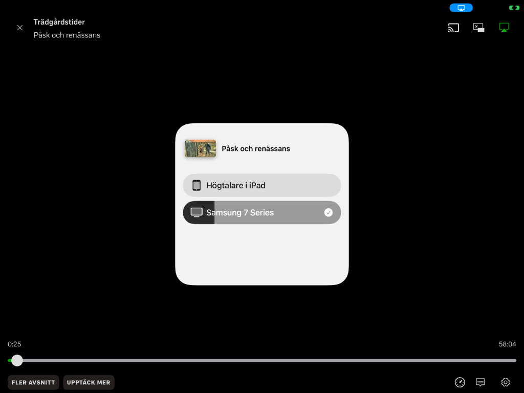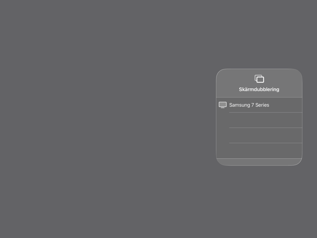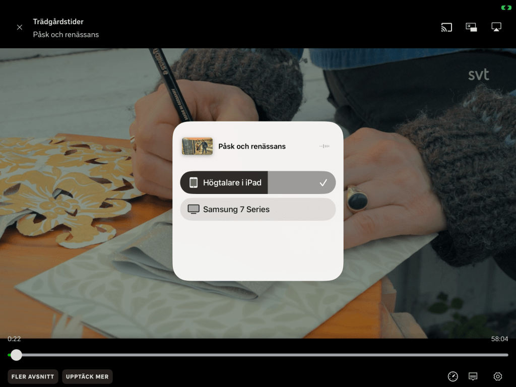 Öppna SVT Play på din iPad eller iPhone. Starta programmet. Svep ner från övre högra hörnet. Tryck på Skärmdubblering. Välj din TV.