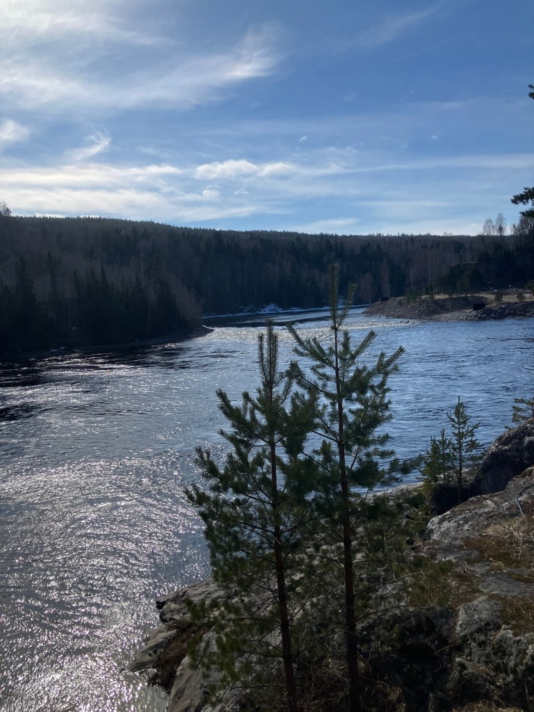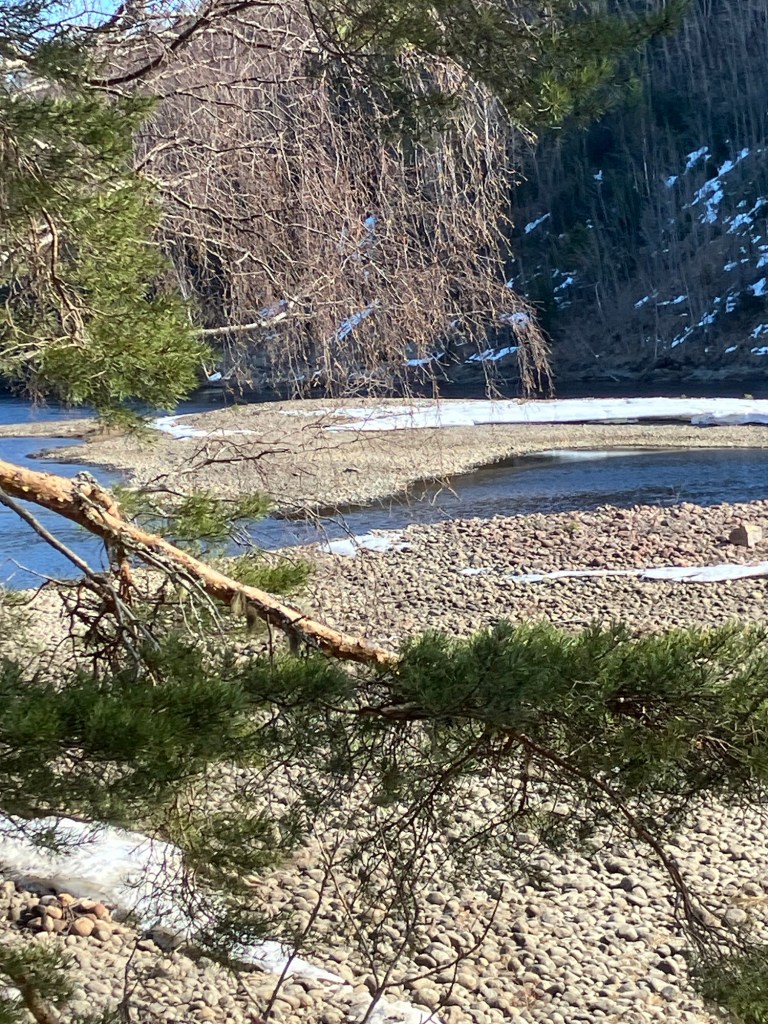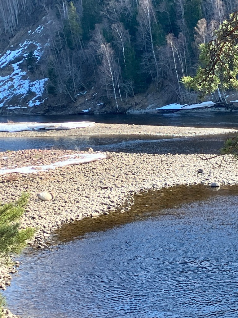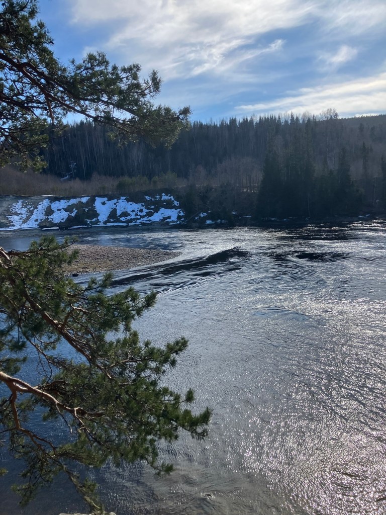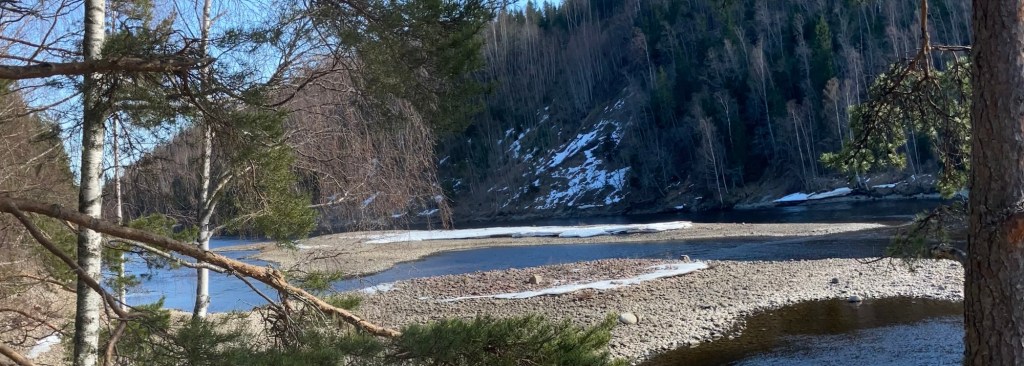 Relativt lågt vatten 97 kbm/sek. Lite kyligt, blåst, men solen värmer. Isen har smält en hel del men fortfarande kvar på flera ställen på södra sidan.
