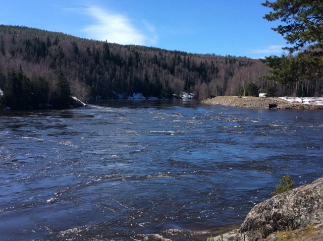 Allstaforsen den 4/6 2018 kl 19.30. Relativt stort flöde ca 180 m3/sek till stor del pga stor avtappning från Gimåsystemet. I skrivande stund är avtappningen från Torpshammars kraftstation 91 m3/sek. Länk till vattenfalls sida https://powerplants.vattenfall.com/sv/torpshammar